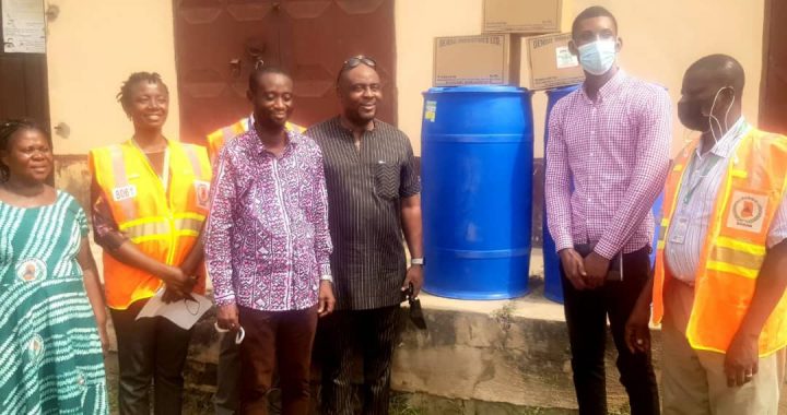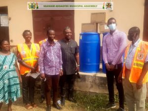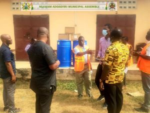 Mr. Benjamin Darko, the factory manager at Densu Industry Limited on behalf of the Company presented three(3) boxes of Denzal disinfectant and Densu power bleach through the Nsawam Adoagyiri Municipal Assembly which was received by the MCE together with the MCD And the Nadmo Director in a short gathering at the municipal assembly premesis on Wednesday the 9th of February, 2022.