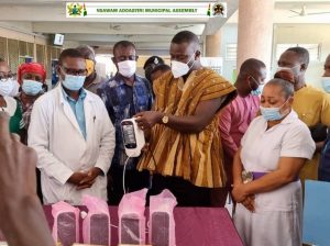 Dr. Kwabena Awuku, the Director in charge of the facility assisted by senior officers of the hospital took delivery of the devices and thanked Hon. Frank Annoh Dompreh for his timely intervention to aid their work, having narrated the difficulties they have been through owing to the repercussions of Covid.