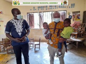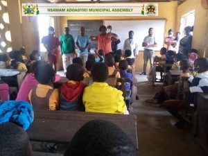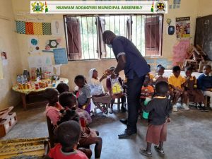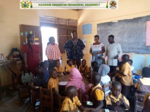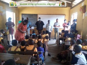 Hon. Isaac Kwadwo Buabeng MCE for NsawamAdoagyiri together with the Municipal Education Director of Nsawam Adoagiri, Mr. Samuel OtopahNtow and some selected staff of the NsawamAdoagyiri Municipal Assembly paid a working visit to children attending school for the first time dubbed “my first day at school” as well as to welcome continuing pupils back to school in the municipality.